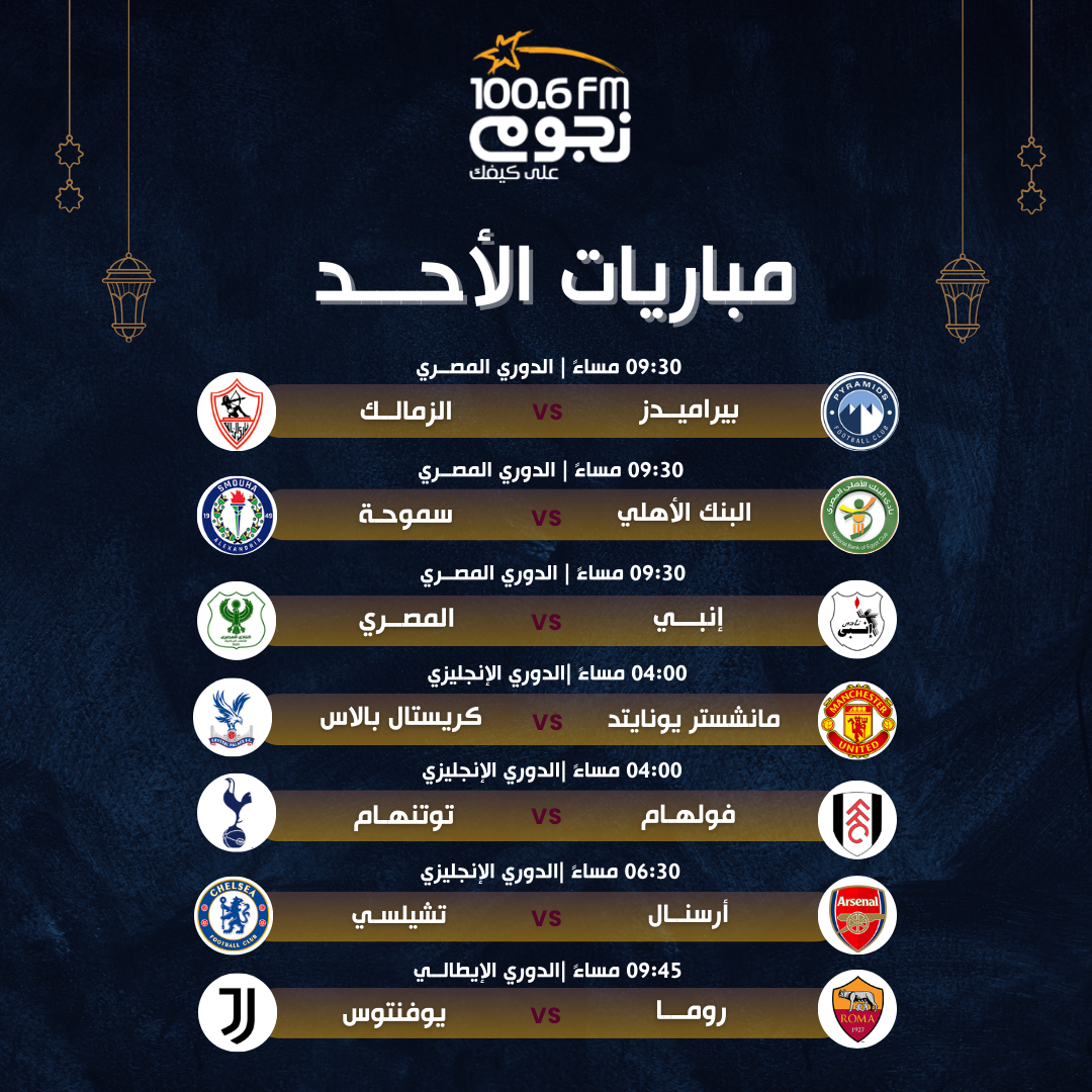 يشهد اليوم الأحد 1 مارس 2026، إقامة عدد من المباريات في مختلف المنافسات، يتصدرها لقاءات في الدوري الإنجليزي الممتاز، إلى جانب مباريات الجولة الـ20 من بطولة الدوري المصري.