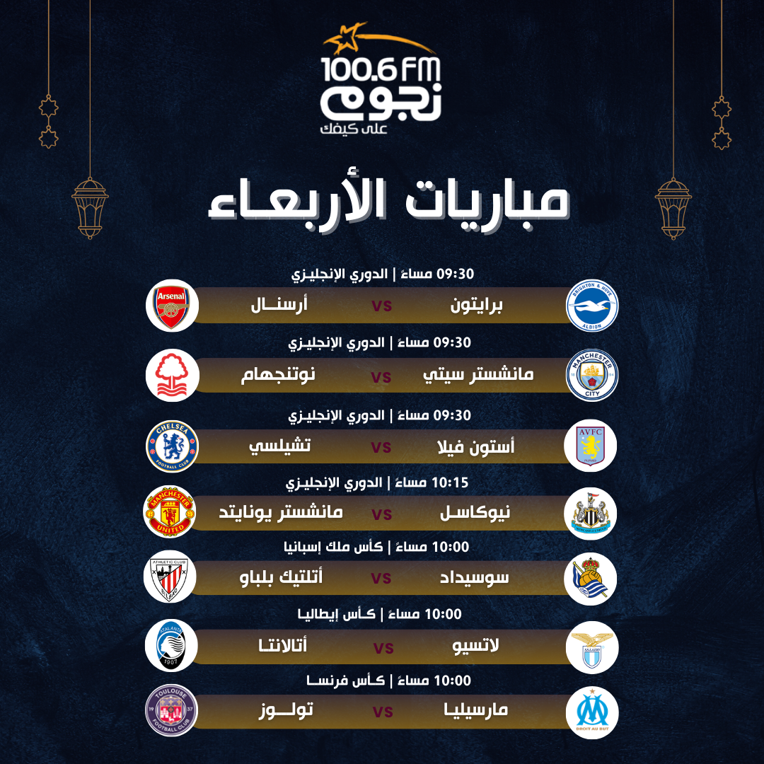 مباريات اليوم الأربعاء