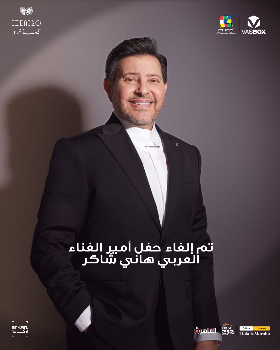 أعلنت شركتا VAS BOX وكيوب ميوزك عن إلغاء حفل أمير الغناء العربي الفنان هاني شاكر، والذي كان من المقرر إقامته يوم الخميس 2 أبريل المقبل على مسرح “تياترو أركان”، وذلك نظرًا لظروفه الصحية التي تعرض لها مؤخرا.