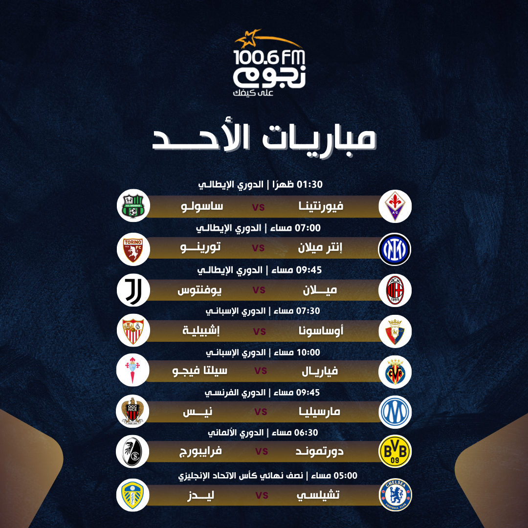 يشهد اليوم الأحد 26 أبريل 2026، إقامة عدد من المباريات في مختلف المنافسات، يتصدرها منافسات بطولة الدوري الإيطالي، إلى جانب مباريات في الدوري الإسباني، ونصف نهائي كأس الاتحاد الإنجليزي.