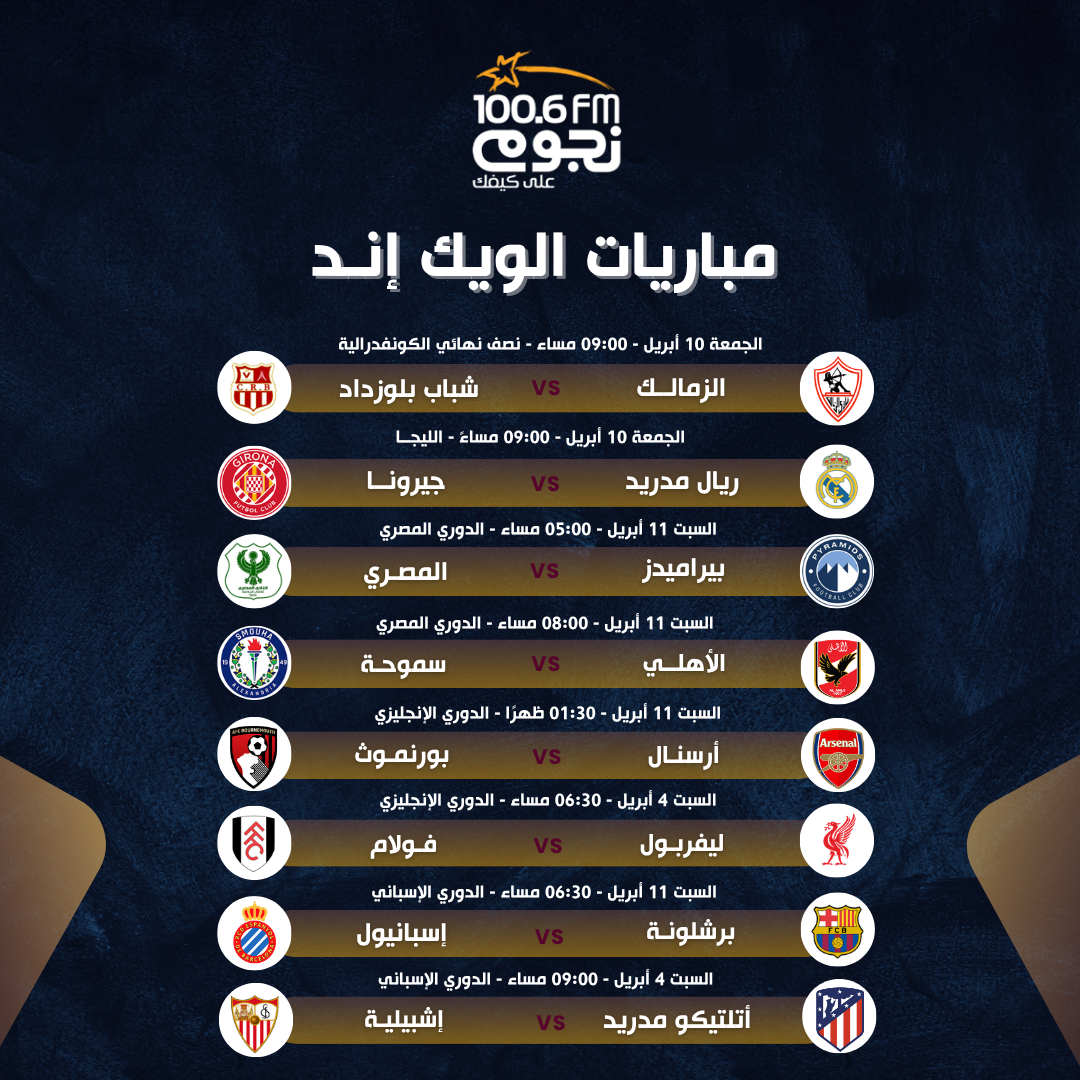 يشهد يوما الجمعة 10 أبريل، والسبت 11 أبريل، إقامة عدد من المباريات في مختلف المنافسات المحلية والأوروبية، بينها: بطولة الدوري المصري، وبطولة الكونفدرالية الأفريقية، بالإضافة إلى منافسات الدوري الإنجليزي الممتاز.