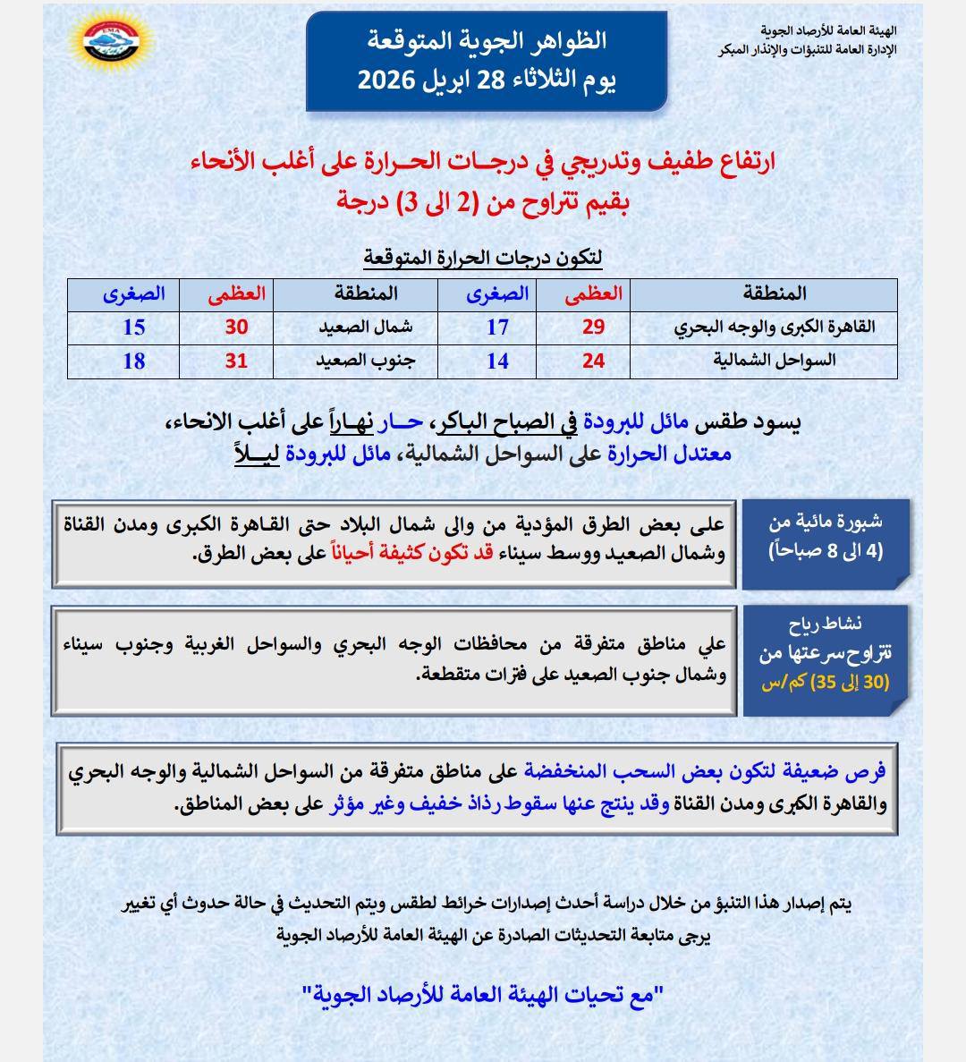 أوضحت هيئة الأرصاد الجوية عبر صفحتها الرسمية على «فيسبوك»، تفاصيل طقس اليوم الثلاثاء 28 أبريل 2026.
