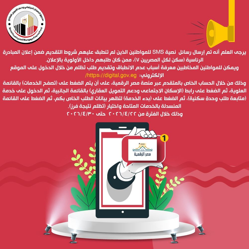 أعلن صندوق الإسكان الاجتماعي ودعم التمويل العقاري عبر الحساب الرسمي على «الفيس بوك»، إرسال رسائل نصية إلى المواطنين غير المنطبق عليهم شروط التقديم ضمن إعلان المبادرة الرئاسية «سكن لكل المصريين 7»، ممن كان طلبهم داخل الأولوية بالإعلان.
